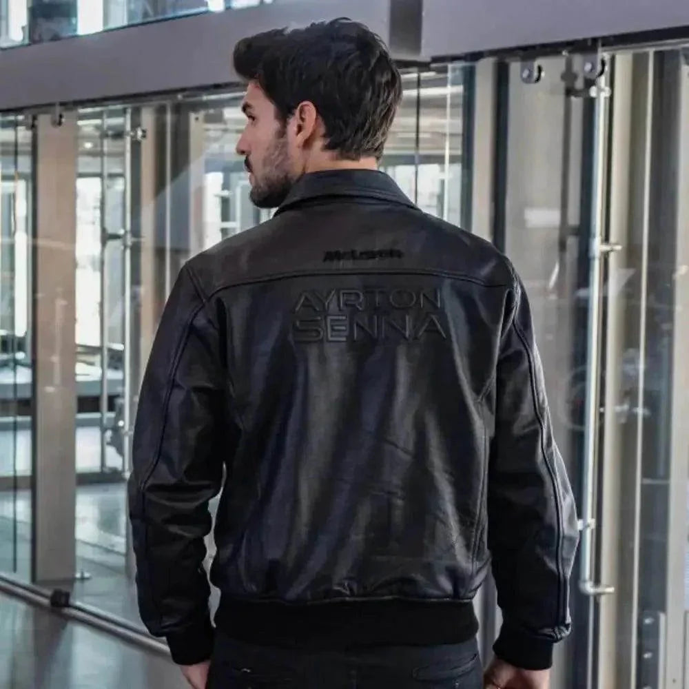 Auf der Brust der schwarzen Lederjacke befinden sich ein gesticktes McLaren- und ein Ayrton-Senna-Logo. Auf dem Rücken ist der Schriftzug „Ayrton Senna“ eingeprägt und zusätzlich ein McLaren-Logo aufgestickt.